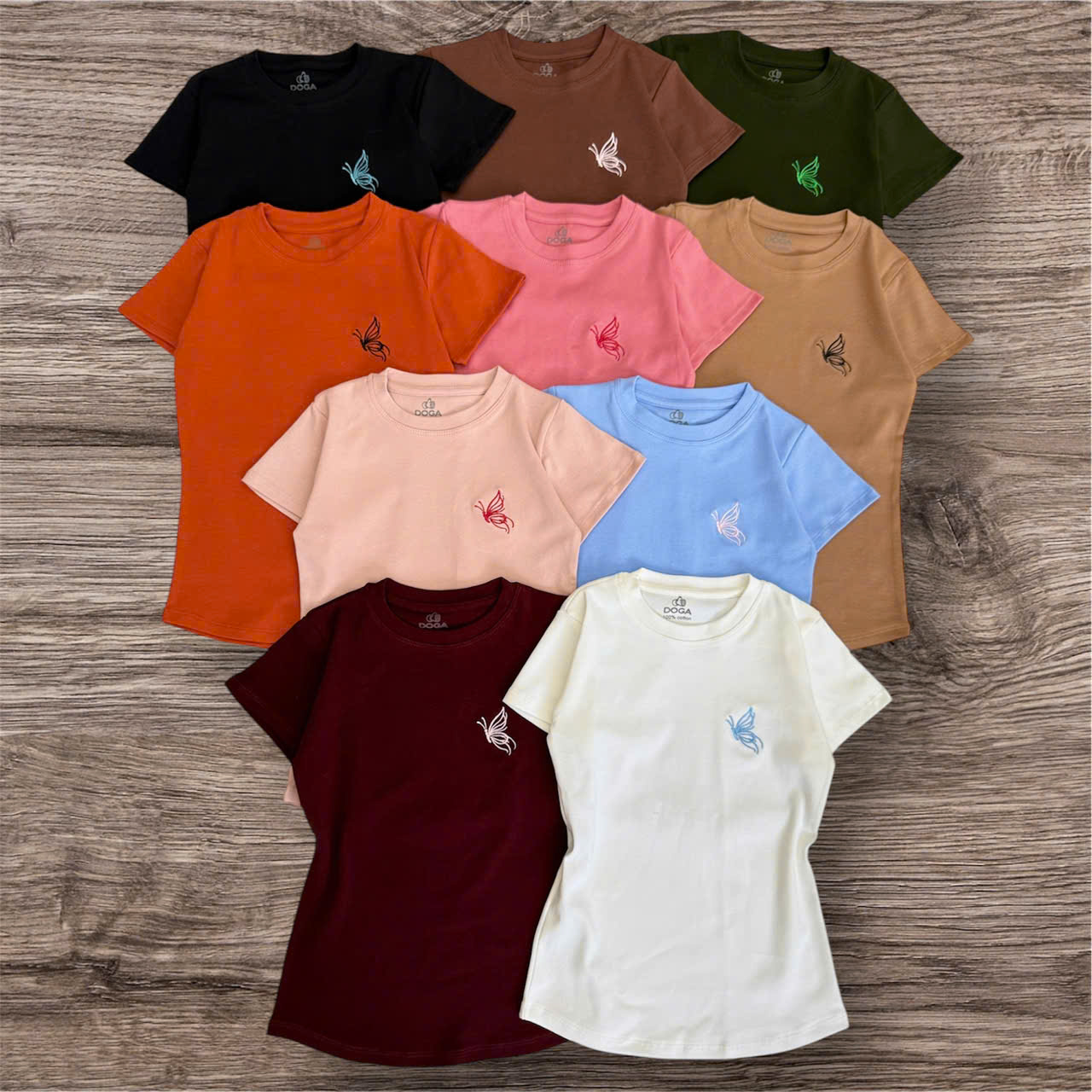 Áo thun ôm body DOGA thêu hình BƯỚM xinh xắn tay ngắn cao cấp, thiết kế cổ tròn với 10 màu.